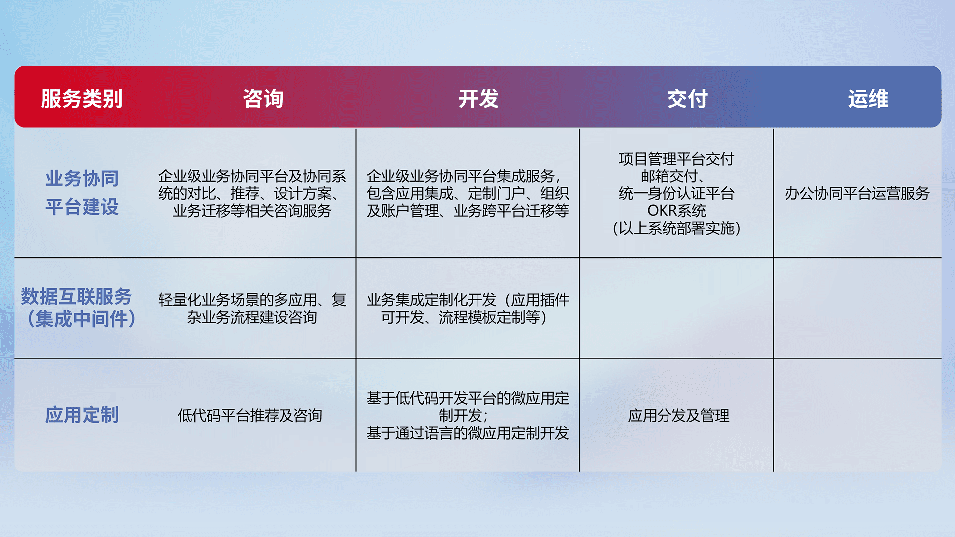 针对钉钉、、企微、、、IDaas等平台级产品提供产品的规划、、方案、、、交付、、、定制化开发等服务,,,实现如统一协同办公、、、智能客户服务、、混合会议管理、、、智能数据查询、、、等业务场景,,实现数字化转型。。。